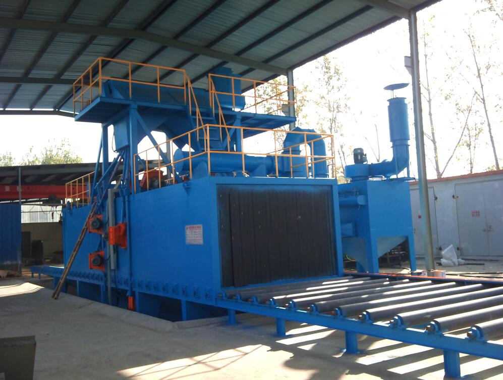 本機為輥道式連續送料的高效率的拋丸清理設備,在清理過程中由電氣控制的可調速輸送輥道將鋼結構件或鋼材送進清理機室體內拋射區時,其工件各個面受到來自不同方位密集的鋼丸打擊與磨擦,使之其上的氧化皮、銹層及其污物迅速脫落,鋼材表面就獲得一定粗糙度的光潔表面,在清理室外兩邊進出口輥道裝卸工件。落入鋼材上面的鋼丸與銹塵經吹掃裝置吹掃,灑落下來的丸塵混合物由回收螺旋輸送到室體漏斗、縱橫向螺旋輸送機匯集于提升機下部,再提升到機器上部的分離器里,分離后的純凈彈丸落入分離器料斗中內,供拋丸循環使用。拋丸清理中產生灰塵埃,由抽風管送向除塵系統,凈化處理后的凈氣排放到大氣中,顆粒狀灰塵被回收。